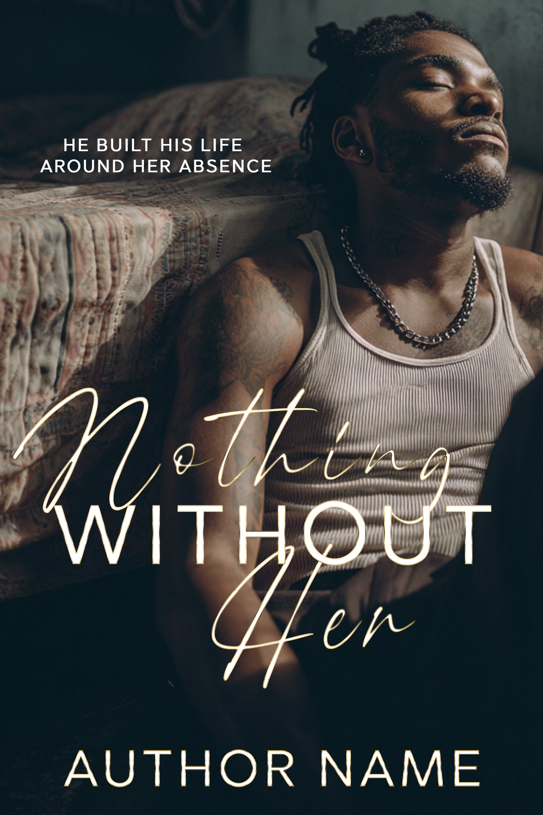 Nothing Without Her is a raw, introspective premade cover designed for romantic suspense, psychological drama, and emotional crime fiction. This cover tells a story of survival after loss—of a man frozen in the aftermath of love, absence, and unanswered grief.